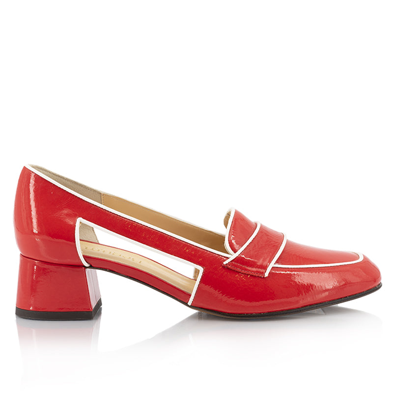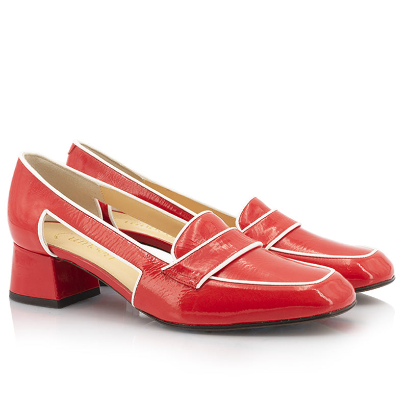 Un mocassin en vernis rétro rouge vif au bout légèrement carré, accentué par une ligne en agneau blanc. Ouvert sur les côtés.