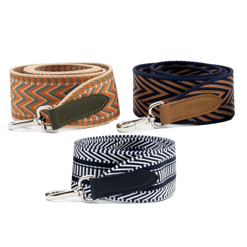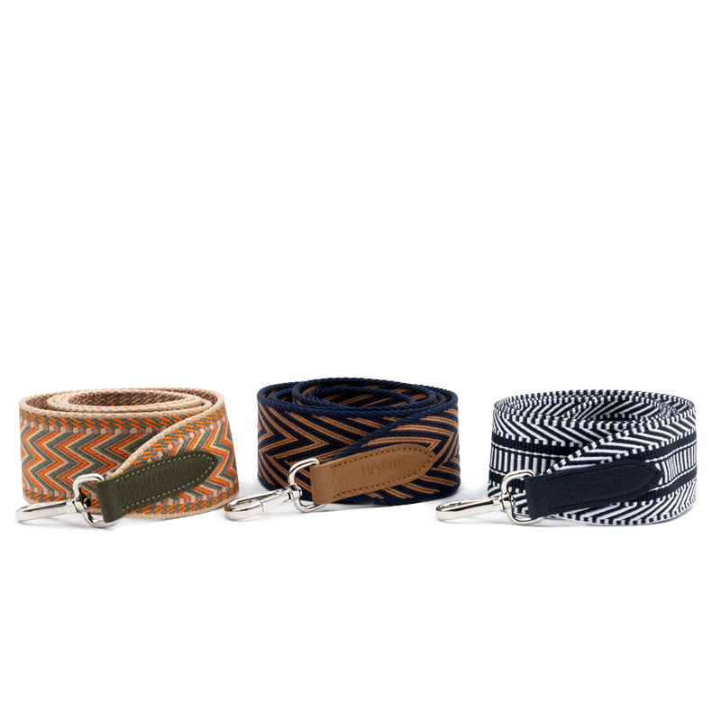 Nos sangles sont fabriquées par notre atelier, terminées avec le cuir assorti à nos sacs, et montées avec des mousquetons argentés.