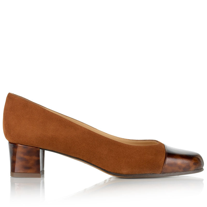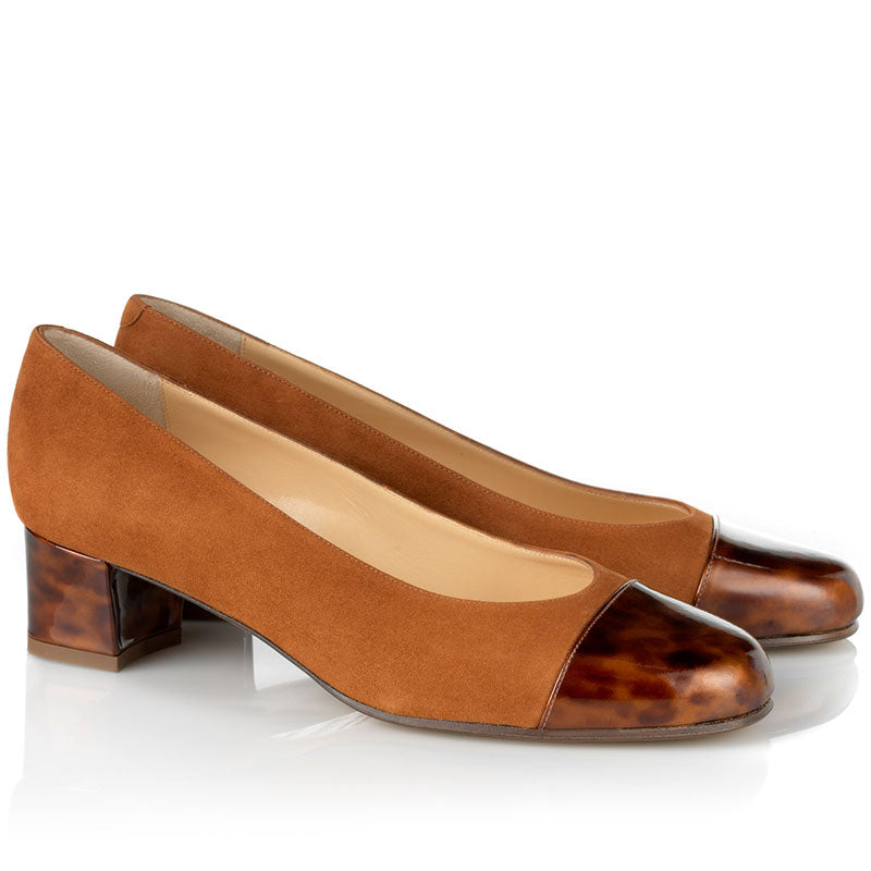 Chèvre velours cognac et cuir verni écaille de tortue, semelle cuir et talon recouvert.