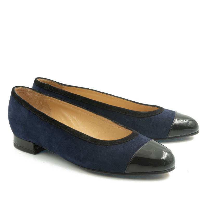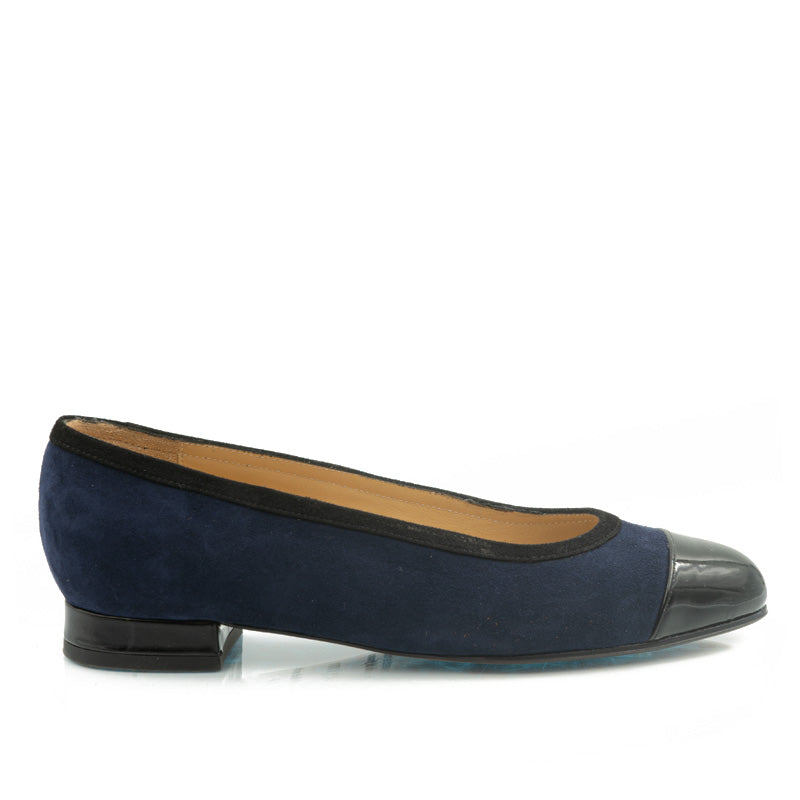 Cette ballerine classique et intemporelle en chèvre velours marine est habillée d'un bout rapporté en cuir verni noir.