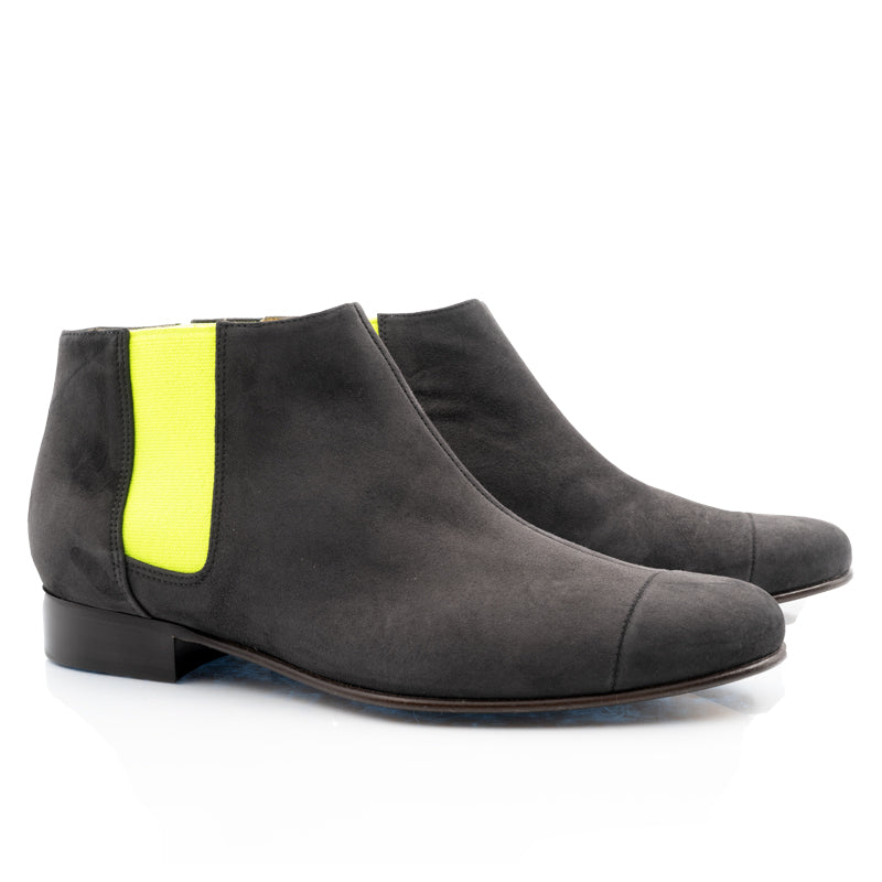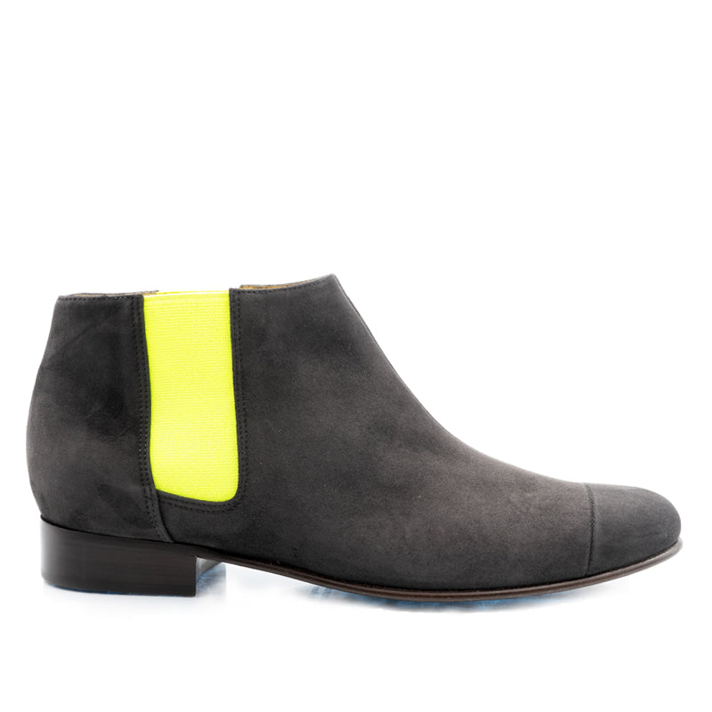 Boots basses en chèvre velours gris foncé avec un élastique jaune fluo. Pour celles qui aiment le confort des boots en toute saison.