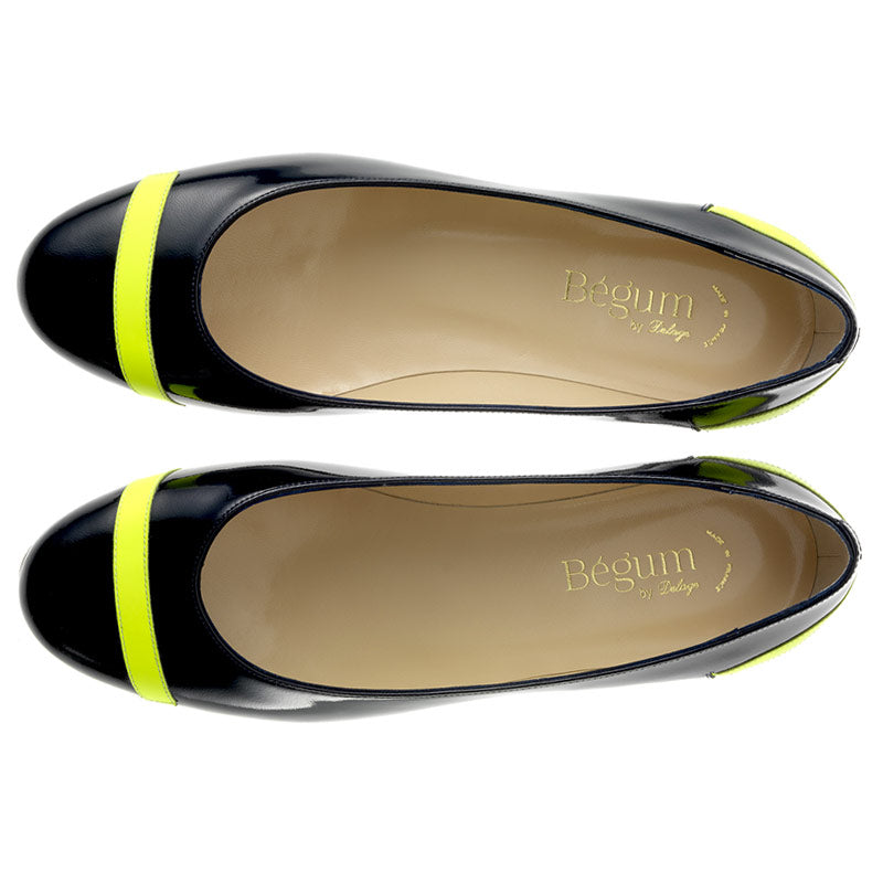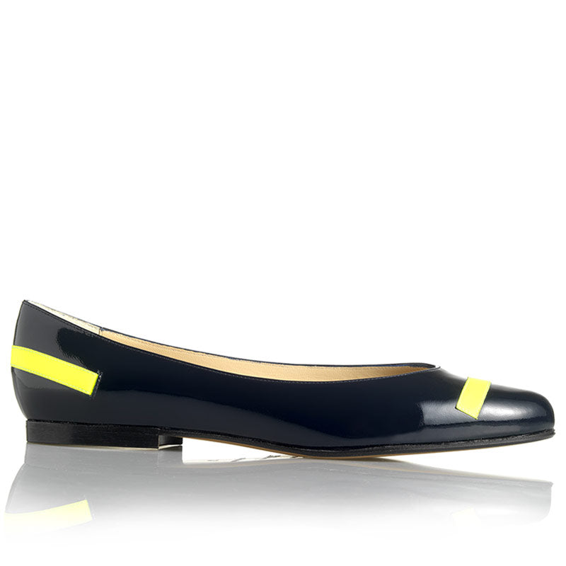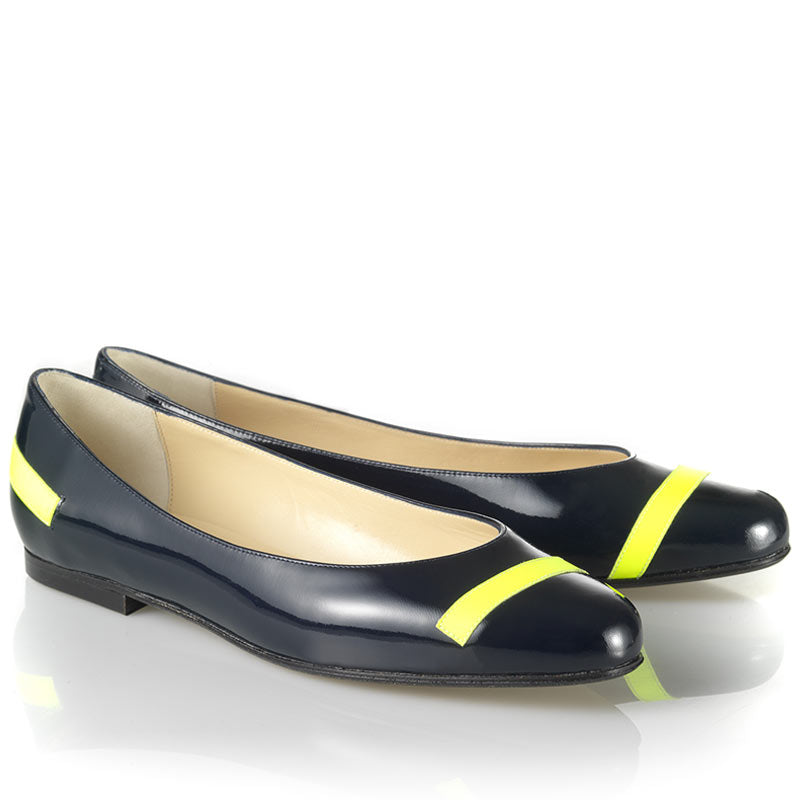 Voici une ballerine qui ne passera pas inaperçue ! En cuir verni bleu nuit, avec une touche fluo qui signale sa ligne épurée, comme un clin d'œil amusé. Talon 1 cm.