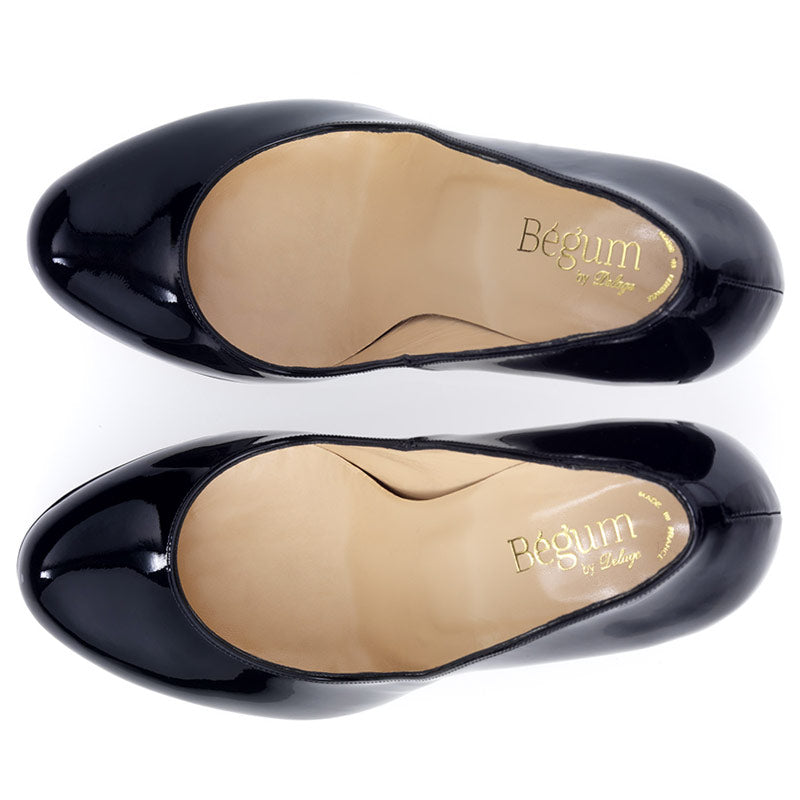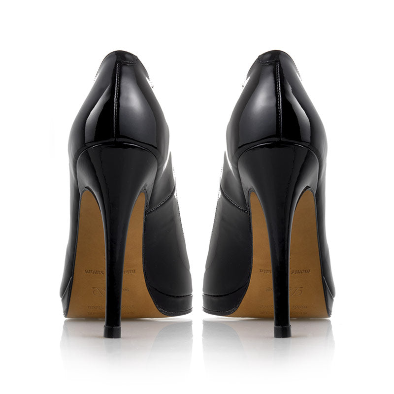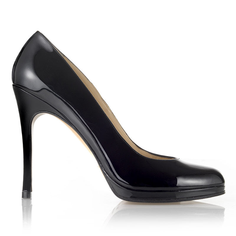 Cuir verni noir, semelle cuir, talon recouvert de cuir verni.