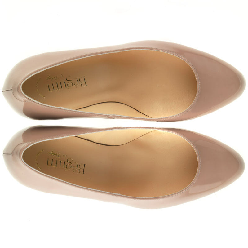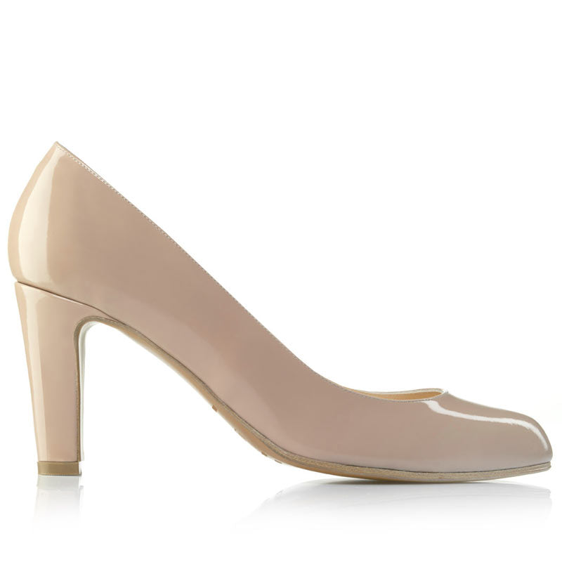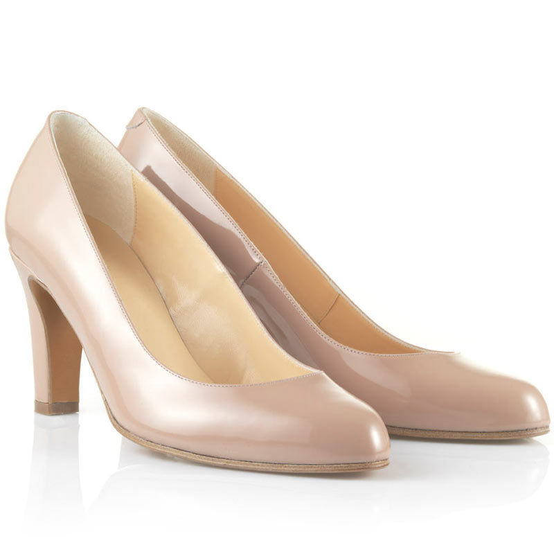 Un escarpin raffiné à porter de jour comme de nuit... Tout est dans le décolleté qui laisse deviner la naissance des orteils. Cuir verni, semelle cuir et talon recouvert.