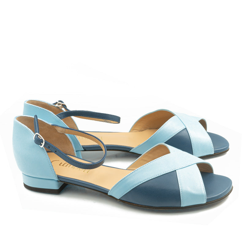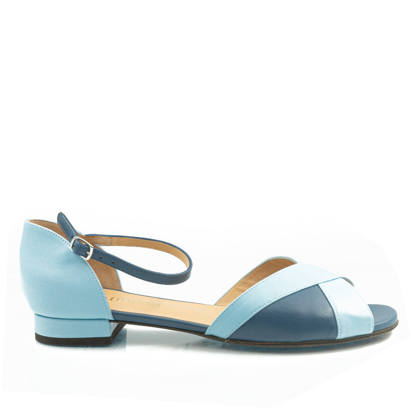 En cuir bleu ciel et bleu denim, semelle cuir et talon recouvert.