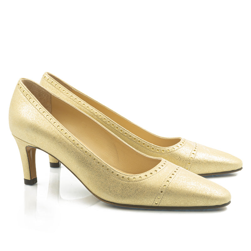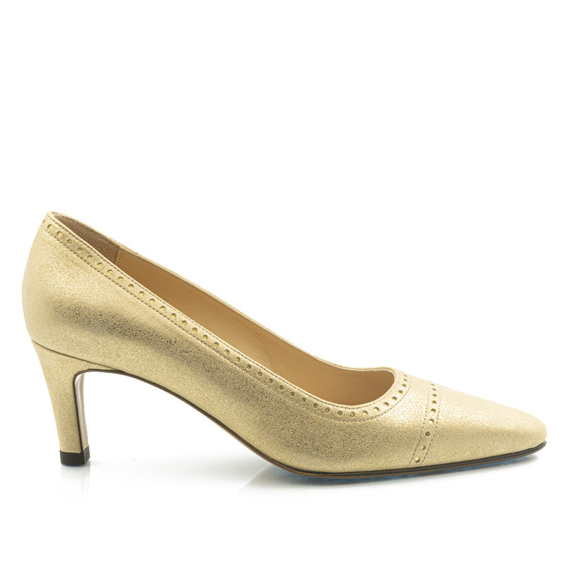 Un escarpin de fête en chèvre doré à décolleté rond souligné par des perforations sur fond agneau or.