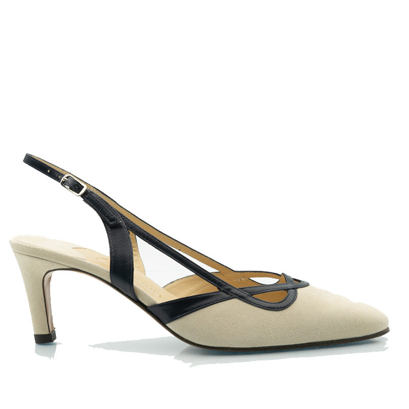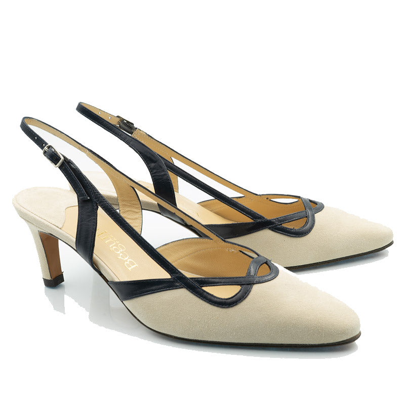 Escarpins en chèvre velours avec une bordure en cuir de couleur contrastée. Talon recouvert.