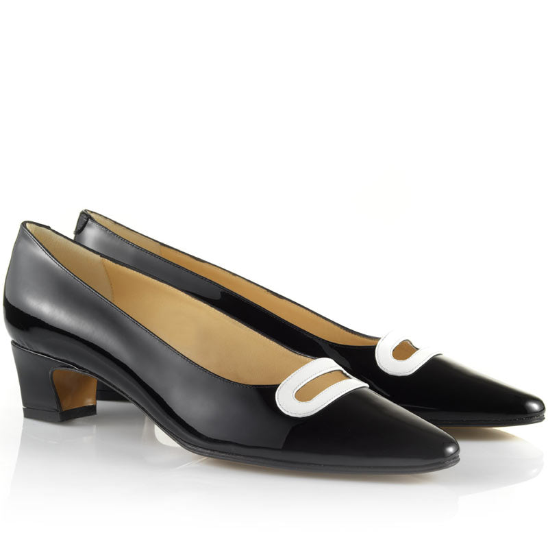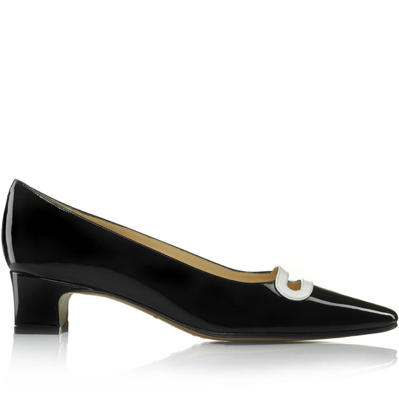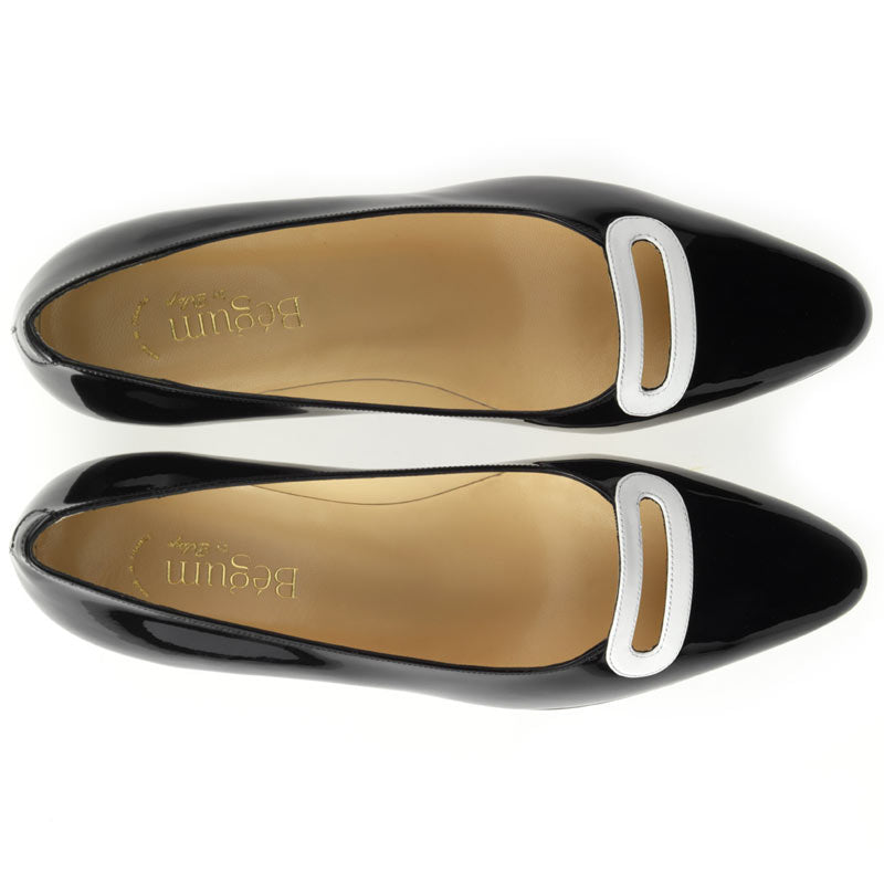 Un esprit sixties souffle sur cet escarpin intemporel à petit talon. Une boucle également en cuir verni apporte un contraste chic et coloré.